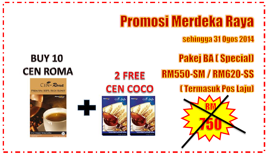 | Terdapat 4 pilihan pakej produk iaitu: Semenanjung 1. Pakej EA (RM170), mendapat 1 Kotak Kopi CenRoma dan 1 Kotak Cen COCO 2. Pakej BA1 (RM370), mendapat 6 Kotak Kopi CenRoma 3. Pakej BA2 (RM370), mendapat 4 Kotak Kopi CenRoma dan 2 Kotak Cen COCO 4. Pakej BA3 (RM370), mendapat 1 Cen Jug Alkali Sabah /Sarawak 1. Pakej EA (RM180), mendapat 1 Kotak Kopi CenRoma dan 1 Kotak Cen COCO 2. Pakej BA1 (RM420), mendapat 6 Kotak Kopi CenRoma 3. Pakej BA2 (RM420), mendapat 4 Kotak Kopi CenRoma dan 2 Kotak Cen COCO 4. Pakej BA3 (RM420), mendapat 1 Cen Jug Alkali | ||||